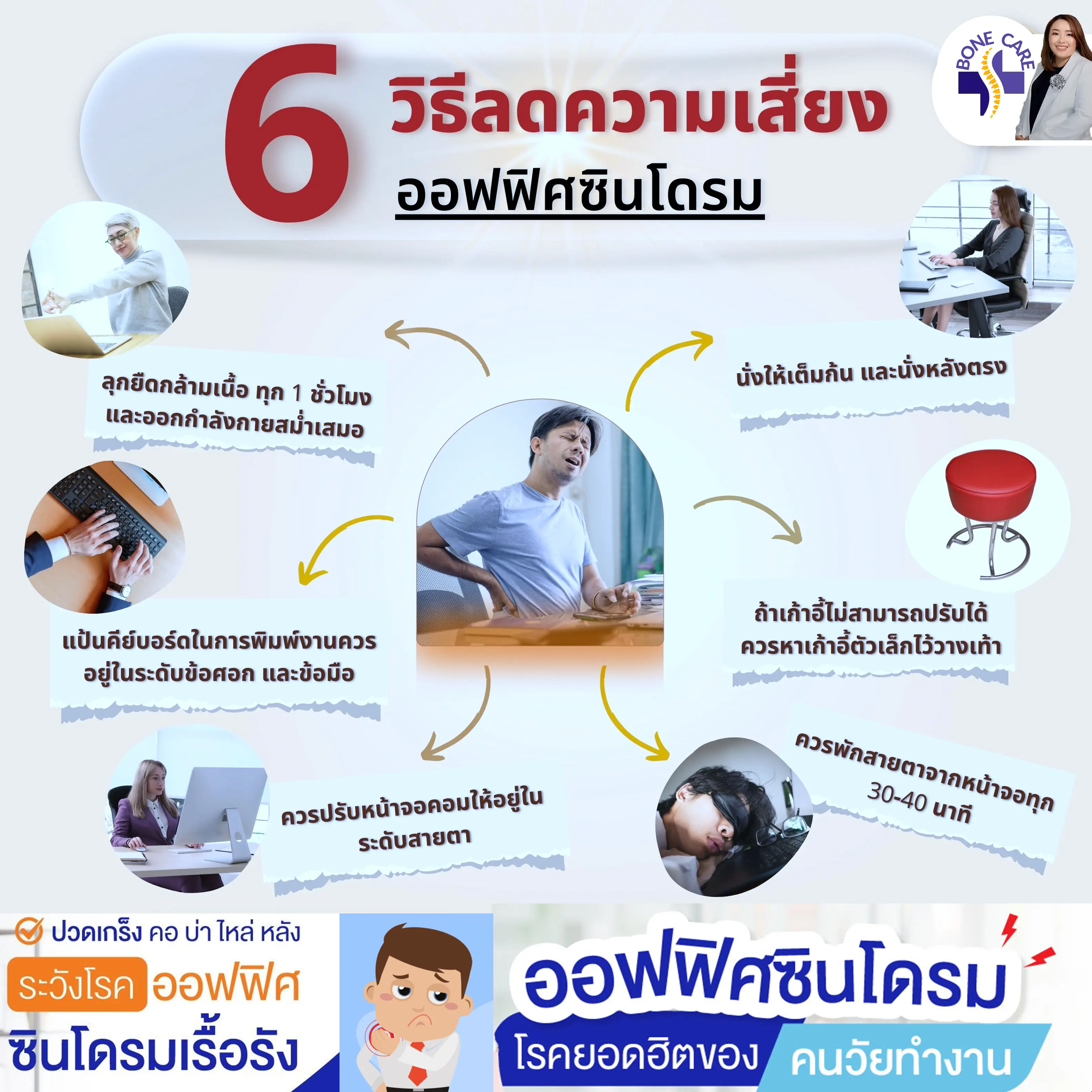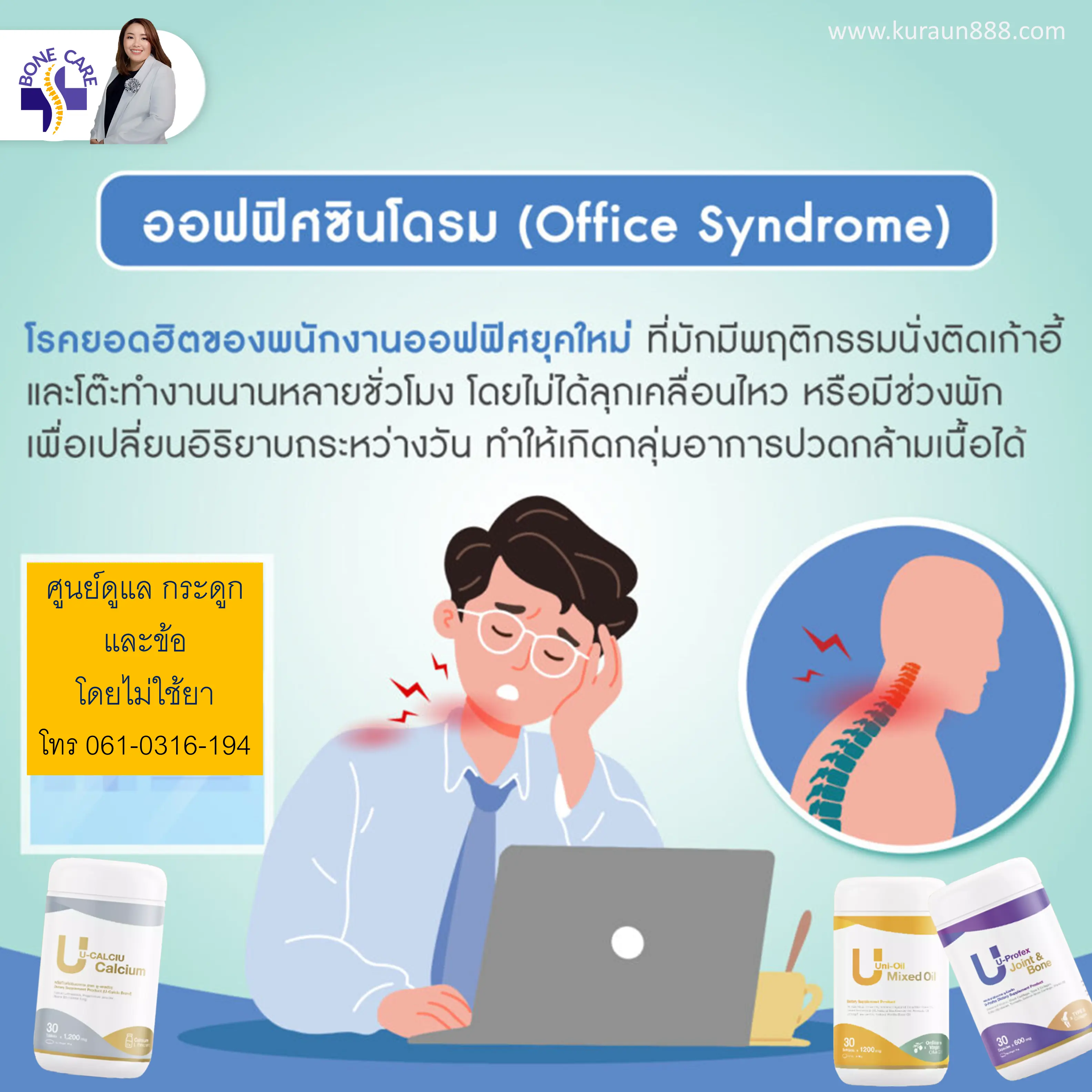 โรคออฟฟิศซินโดรม ไม่ใช่โรคร้ายแรง สามารถรักษาหายได้ ซึ่งโรคนี้จะมีอาการปวดกล้ามเนื้อที่เกิดจากการใช้กล้ามเนื้อมัดเดิมซ้ำๆ นานๆ ซึ่งจะพบส่วนใหญ่ได้ในพนักงานออฟฟิศ คนออกกำลังกาย หรือแม้กระทั่งนักกีฬา แต่ในสถานการณ์ในปัจจุบันในคนอายุน้อยๆ เช่นนักเรียน และนักศึกษา หรือคุณครู ที่มีการเรียนการสอนผ่าน Online ทำให้มีการนั่งหน้าคอมพิวเตอร์หรืออยู่กับหน้าจอโทรศัพท์เป็นเวลานาน ทำให้เกิดอาการปวดหลัง ปวดคอ ปวดบ่า ปวดไหล่ และมีอาการชาร่วมด้วย